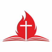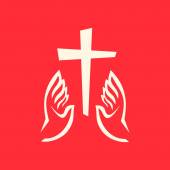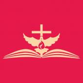 Chrześcijańska ilustracja. Logo kościoła. Krzyż Pana Jezusa Chrystusa, gołąb w płomieniach - jako symbol Ducha Świętego Boga i otwartą Biblię.