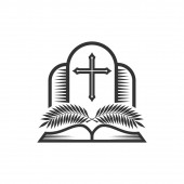 Chrześcijańska ilustracja. Logo kościoła. Chwała Chrystusa w kościele, gałązki palmowe i otwarta Biblia.