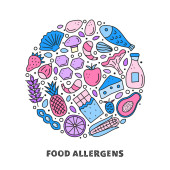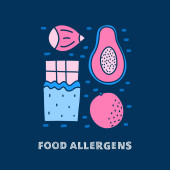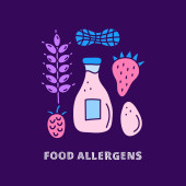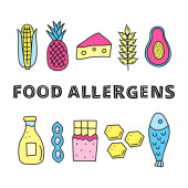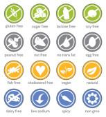 Zestaw ikon produktów wolnych od alergenów. Bez mleka, bezglutenowe, bez orzechów, bez pszenicy, bez jaj, bez cukru. Organiczne i wegańskie ikony. Może być również stosowany do produktów wegańskich, wegetariańskich i dietetycznych.