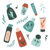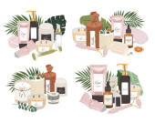 Różne narzędzia i zabiegi pielęgnacji skóry urody, serum, krem nawilżający, maseczka nasenna, masaż wałkiem do twarzy i świeca zapachowa, koncepcja odnowy biologicznej i dobrego samopoczucia, pojedyncze ilustracje wektorowe