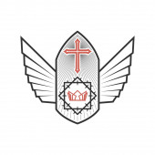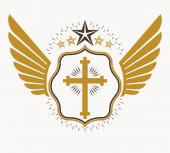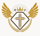 Chrześcijańska ilustracja. Logo kościoła. Krzyż Jezusa, korona królewska i skrzydła Ducha Świętego.