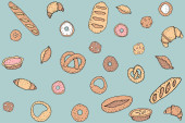 Ręcznie narysowany wzór w kawiarni. Szkic linii sztuki słodkie ciasto gorące świeże śniadanie. Organiczne kawy ziarna cafe menu aplikacja wektor kreskówek ilustracja