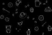 Zdjęcie "Ręcznie narysowany wzór w kawiarni. Szkic linii sztuki słodkie ciasto gorące świeże śniadanie. Organiczne kawy ziarna cafe menu aplikacja wektor kreskówek ilustracja" może być wykorzystywane do celów osobistych i komercyjnych zgodnie z warunkami zakupionej licencji Royalty-free. Obraz jest dostępny do pobrania w jakości wysokiej rozdzielczości do 5760x3840.