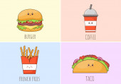 Dziecko je Fast Food Tło Wektor Ilustracja z żywności na hamburgera, Pizza, pączki, frytki, Hot Dog lub Cola. Smaczny posiłek w stylu płaskim