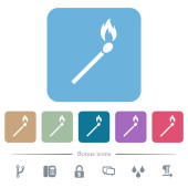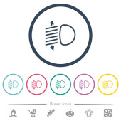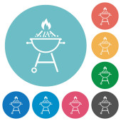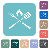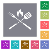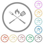 Widelec do grilla i łopatka z płomieniem płaskie ikony kolorów w okrągłych zarysach. 6 ikon bonusowych.