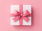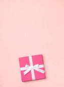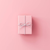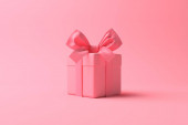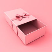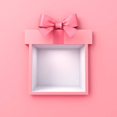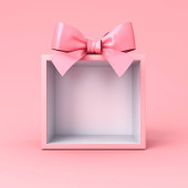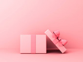 Otwarte pudełko lub puste różowy pastelowy kolor pudełko związane z różową wstążką i łuk izolowane na różowy pastelowy kolor tła ściany z cieniem minimalny konceptualny 3D renderowania