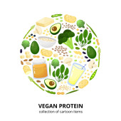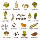 Zestaw wegańskich źródeł białka w stylu kreskówki izolowane na białym tle z nazwami.