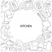 Ramka z narzędzi kuchennych doodle na tablicy. Ilustracja wektora. Idealny do tapet, wypełniaczy wzorów, tekstyliów, tła strony internetowej, tekstury powierzchni.
