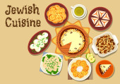Kuchnia żydowska wektor shakshuka, hummus, zupa z makaronem kurczaka lub klopsiki z sosem pomidorowym. Żółcień wołowa, zupa z ciecierzycy i gulasz z soczewicy jagnięcej z suszonymi morelami, nadzienie z piersi kurczaka Jerozolima żywności