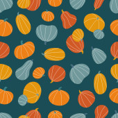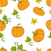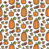 Płynny wzór z ręcznie rysowane doodle dynie i liście. Płaskie, kolorowe warzywa. Projekt na dzień dziękczynienia lub święto Halloween. Ilustracja wektora jesieni.