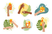 Duży zestaw ekologicznych produktów do pielęgnacji skóry, olejek do twarzy, kamienie gua sha i wałki wykonane są z zielonego jadeitu. Strona główna Pielęgnacja skóry piękna rutyna. Ilustracja wektora narysowanego ręcznie.