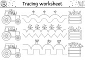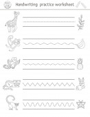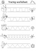 Wektor Święto Dziękczynienia arkusza ćwiczeń pisma ręcznego. Jesienią można wydrukować czarno-białe aktywności dla dzieci w wieku przedszkolnym. Jesień śledzenia gry do pisania umiejętności z cute indyków i zbiorów