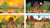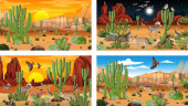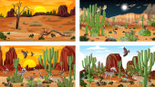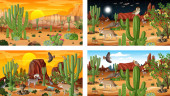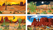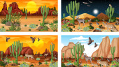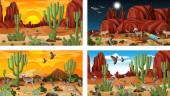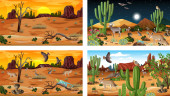 Różne sceny z pustynnym krajobrazem lasu ze zwierzętami i roślinami ilustracja