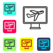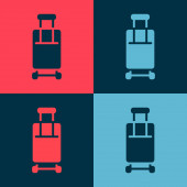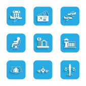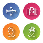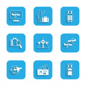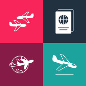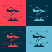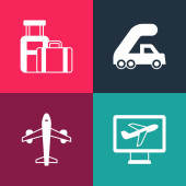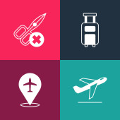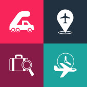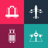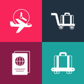 Zestaw pop art Samolot, lądowanie, Taśma transportowa z walizką i ikoną samolotu kalendarzowego. Wektor