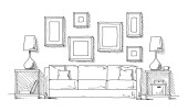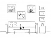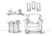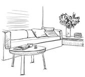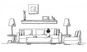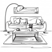 Szkic wnętrza salonu. Kanapa i inne meble do wypoczynku. Ilustracja wektora.