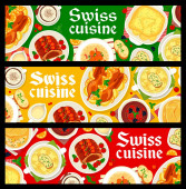 Szwajcarskie potrawy z restauracji. Kiełbaski z kiszoną kapustą, Raclette z ziemniakami i ogórkami, zupa minestronowa, fondue serowy i sznycel, risotto, Fritter Rosti i wektor ravioli chard