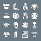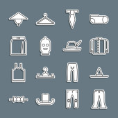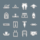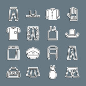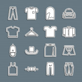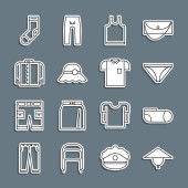 Zdjęcie "Zestaw spodnie linii, T-shirt, Sport skarpety, azjatycki stożkowy kapelusz, torba, Long sleeve i ikona Biustonosz. Wektor" może być wykorzystywane do celów osobistych i komercyjnych zgodnie z warunkami zakupionej licencji Royalty-free. Obraz jest dostępny do pobrania w jakości wysokiej rozdzielczości do 5760x3840.