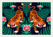Dwa stylizowane chińskie tygrysy na czerwonym tle. Orientalne tradycyjne projektowanie kart w stylu retro.