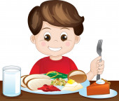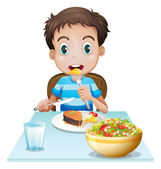 Mały chłopiec chętnie je śniadanie. Ilustracja wektora
