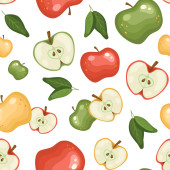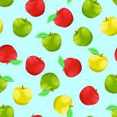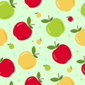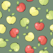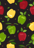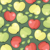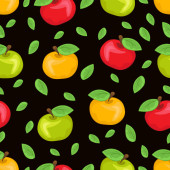 Wzór, ilustracja kolorowych jabłek z liśćmi na ciemnym tle..