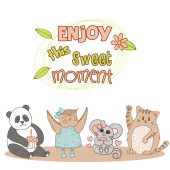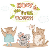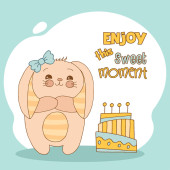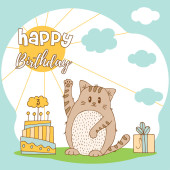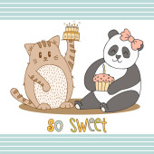 Ręcznie rysowane słodkie zwierzęta z literami. Kot ze świeczkami. Ciesz się tą słodką chwilą. Białe tło. Wektor.