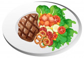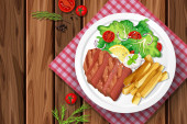 Zdrowe śniadanie ze stekiem i frytkami smażone i sałatka ilustracja