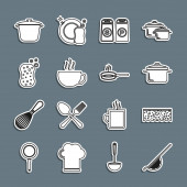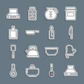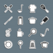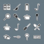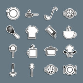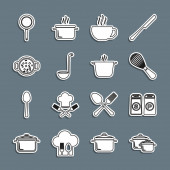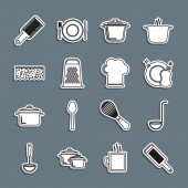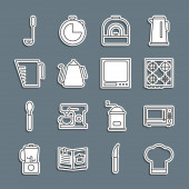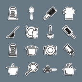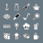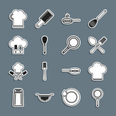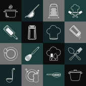 Ustaw linię Kuchnia trzepaczka Grater Sól i pieprz patelnia Gotowanie garnek Chef kapelusz i ikona krzyż widelec. Wektor.