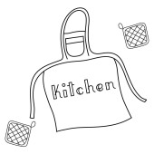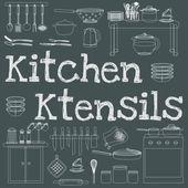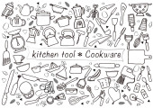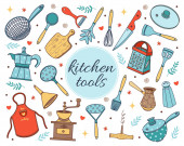 Zestaw narzędzi kuchennych różnych naczynia, zestaw sztućców, miski, potholders, fartuchy, noże, garnki i patelnie zarys prosty minimalistyczny płaski wzór wektor ikony ilustracji izolowane na białym tle