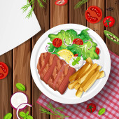 Zdjęcie "Stek z frytkami i sałatką ilustracja" może być wykorzystywane do celów osobistych i komercyjnych zgodnie z warunkami zakupionej licencji Royalty-free. Obraz jest dostępny do pobrania w jakości wysokiej rozdzielczości do 5760x3840.