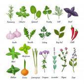 Jadalne zioła z imieniem i nazwiskiem. Zdrowe składniki roślinne i przyprawy. Szałwia, tarragon, rozmaryn, kolendra, koperek, lawenda, mięta, tymianek, chili, pikantny, pietruszka, trawa cytrynowa wektor płaski
