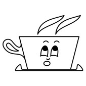 Trójkątna filiżanka na herbatę, kawa z parą. Logo kawiarni. Twarz z emocjami - radość, szaleństwo, niespodzianka. Ikona wektora, zarys, izolacja.