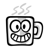 Oryginalny projekt filiżanki do gorących napojów. Kubek na parze - gorąca herbata, czekolada, mleko. Twarz z emocjami. Ikona wektora, zarys, izolacja.