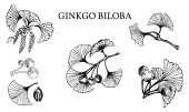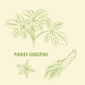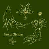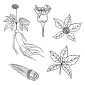 Rysunek liści i korzenia żeń-szenia. Korzeń żeń-szenia i rysunek wektora jagód. Szkic rośliny leczniczej. Liniowy projekt graficzny.