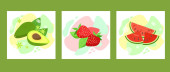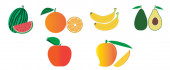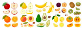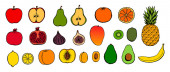 Ikony owocowe. Ilustracja wektora odizolowana na białym tle. Gruszka z awokado z jabłkami bananowymi.