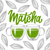 Ręcznie rysowany szkic napoje matcha i desery, ilustracja wektor.