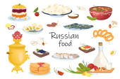 Hiszpańskie elementy żywności odizolowany zestaw. Pakiet tradycyjnych dań - paella, gazpacho, tortilla, churros, tapas, dania mięsno-warzywne lub składniki. Ilustracja wektora w płaskiej konstrukcji kreskówki