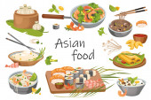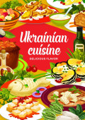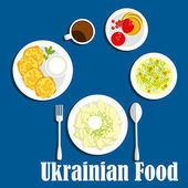 Ukraińskie elementy żywności odizolowany zestaw. Pakiet tradycyjnych dań - barszcz, pierogi, kapusta, pączki czosnkowe, bekon, owsianka kukurydziana, dania warzywne. Ilustracja wektora w płaskiej konstrukcji kreskówki