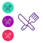 Zdjęcie "White line Crossed knife and fork icon isolated on white background. Cutlery symbol. Red circle button. Vector" może być wykorzystywane do celów osobistych i komercyjnych zgodnie z warunkami zakupionej licencji Royalty-free. Obraz jest dostępny do pobrania w jakości wysokiej rozdzielczości do 5760x3840.