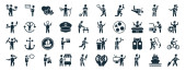 zestaw 40 wypełnionych ikon sportowych w stylu glifowym, takich jak home run, mężczyzna grożący pięścią, motocross, drift car, sztaby ważone, łyżwiarstwo, ikony piłki siłowni izolowane na białym tle
