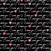 Płynny wzór, tekst kocham cię, ręcznie pisane słowa, różowe serca. Szkic, bazgroły, liternictwo, szczęśliwe Walentynki. Wektor ilustracja czarny tło