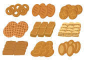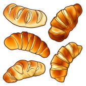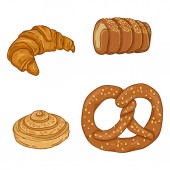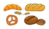 Set of wheat and rye bread, cake, bagel, croissant, baguette hand drawn in cartoon style
