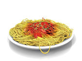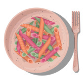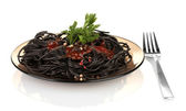 Wektor czarny długi makaron z serem i ziołami w szmaragdowej płycie z widelcem izolowane na białym tle. Górna część widoku.