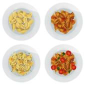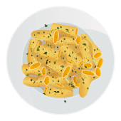 Makaron penne rigate w płycie izolowane na białym tle. Ilustracja wektora. Górna część widoku.