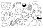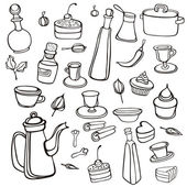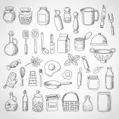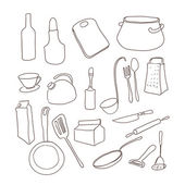Zestaw narzędzi kuchennych bazgroły. Ręcznie rysowany sprzęt kuchenny. Linie ikona narzędzi kuchennych i naczyń kuchennych. Ilustracja wektora na białym tle. izolowane elementy konstrukcyjne i dekoracyjne