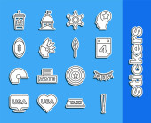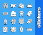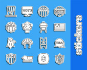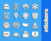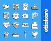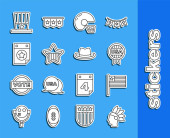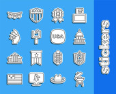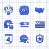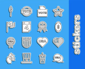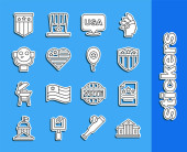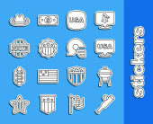 Ustaw linię American flag, USA Dzień Niepodległości, Głosuj, Tarcza z gwiazdami, Burger, boisko do piłki nożnej, pudełko i ikona dolara. Wektor