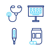 Ustaw linię Odruch neurologiczny młotek, Nożyczki medyczne, Stetoskop i ikona termometru cyfrowego. Wektor