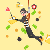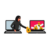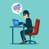 Zdjęcie "Scammer kradnie dane.Fraud, phishing w internecie.Złodziej oszukuje online.Płaski ręcznie rysowany bohater kreskówki.Mężczyzna robi afaire za pomocą laptopa.Swindler, łotr w paski ubrania i beanie.Isolated.Vector" może być wykorzystywane do celów osobistych i komercyjnych zgodnie z warunkami zakupionej licencji Royalty-free. Obraz jest dostępny do pobrania w jakości wysokiej rozdzielczości do 5760x3840.