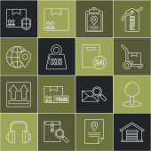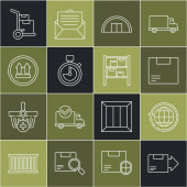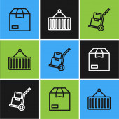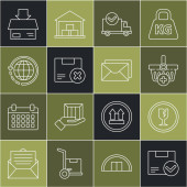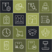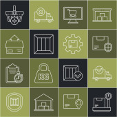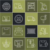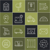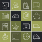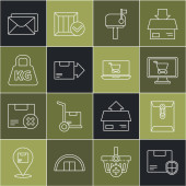 Zestaw linii kruche stłuczone szkło, Pojemnik, Dostawa z pudełkami, Dodaj do koszyka, Koperta, znak kontrolny ciężarówka, ekran zakupów online i ikona kartonu. Wektor