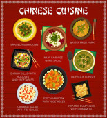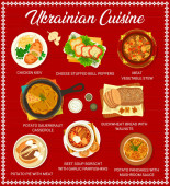 Menu kuchni rosyjskiej, potrawy i obiady lub kolacje, wektor. Kuchnia rosyjska restauracja okroshka zupa z naleśnikami blini, czarna herbata z bublik bajgla i kapusty ciasta z zupą shchi