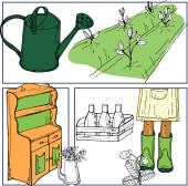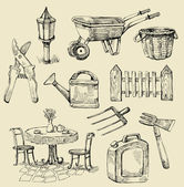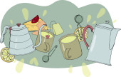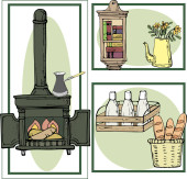 Ilustracja wektorowa czarno-biała sylwetka przedmiotów gospodarstwa, kominek, szafka półka z książkami, naczynia kuchenne, ekspres do kawy, chleb, do projektowania